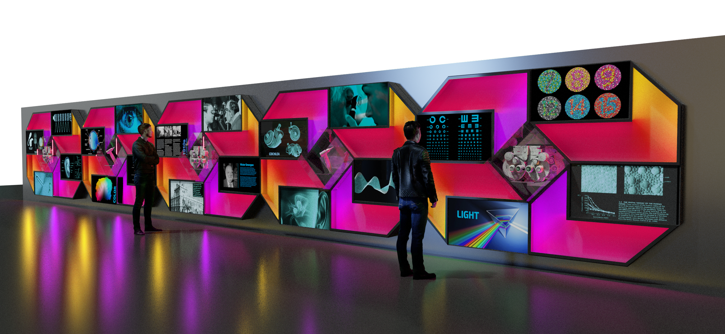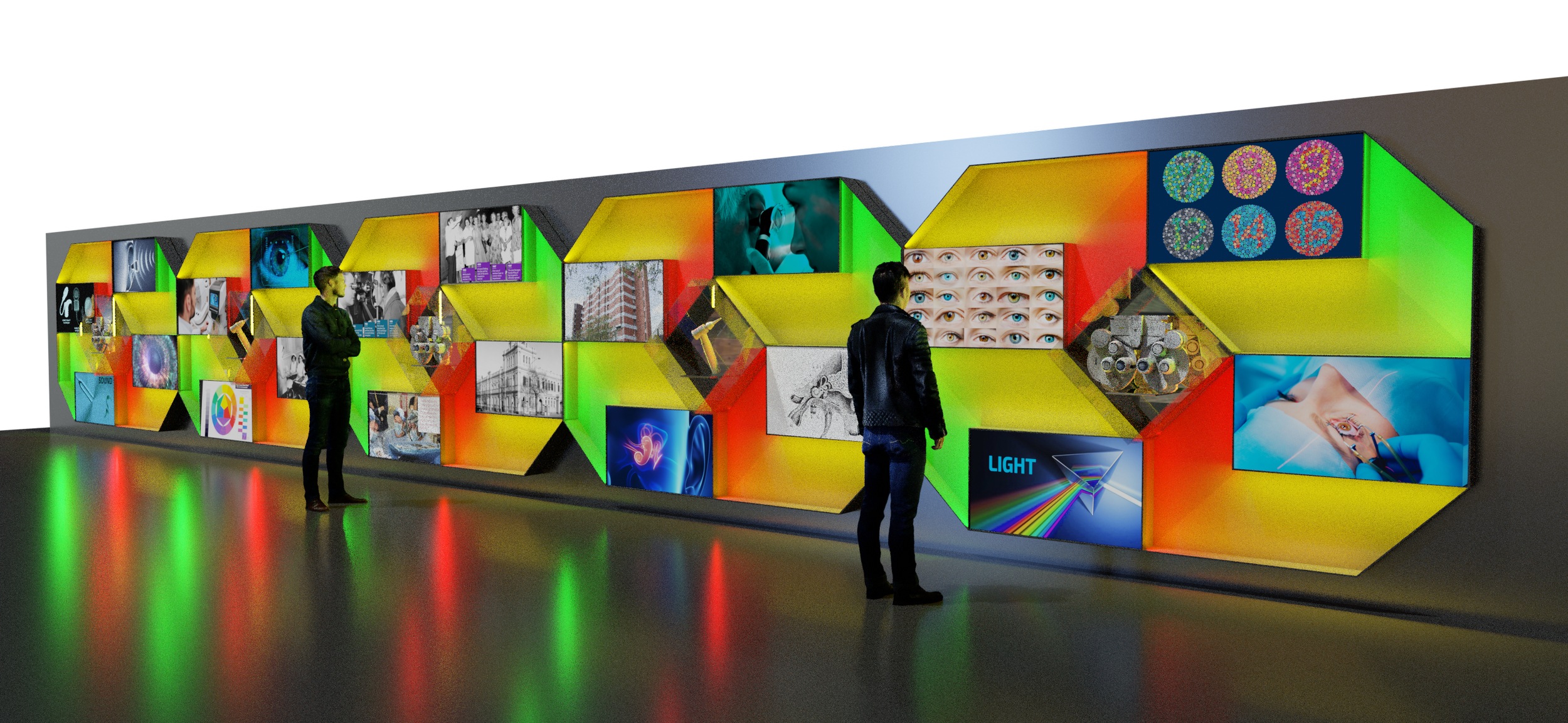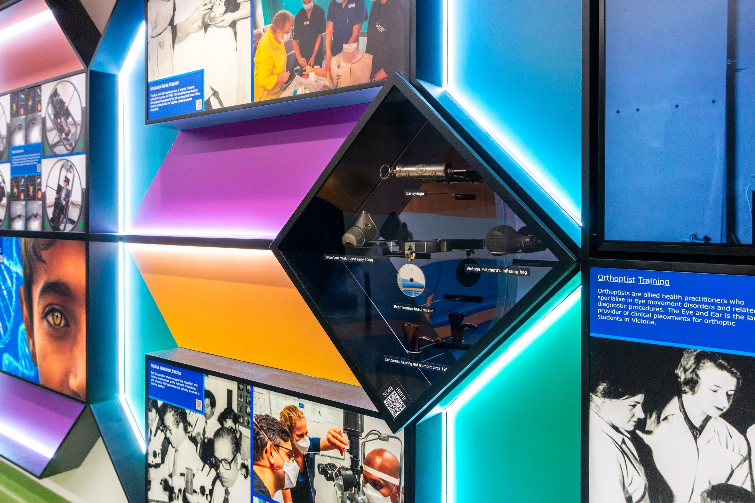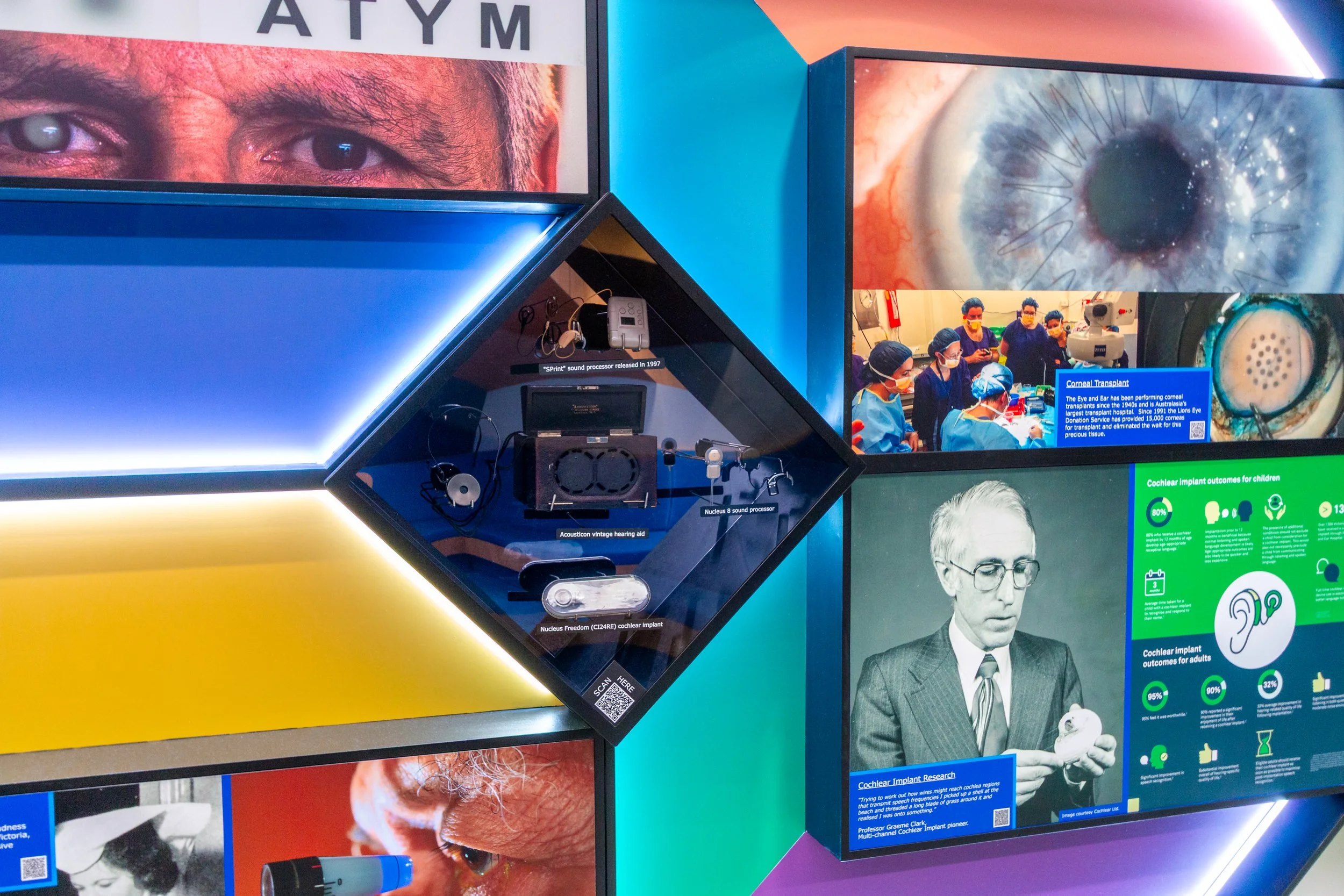 By integrating custom-fabricated mounts for archival instruments with bespoke documentary development, the installation vividly illustrates the evolution of bionic research and sensory science. The design honours the institutional pillars of Teaching, Healing, and Research, providing visitors with a clear window into the hospital’s global reputation for excellence.